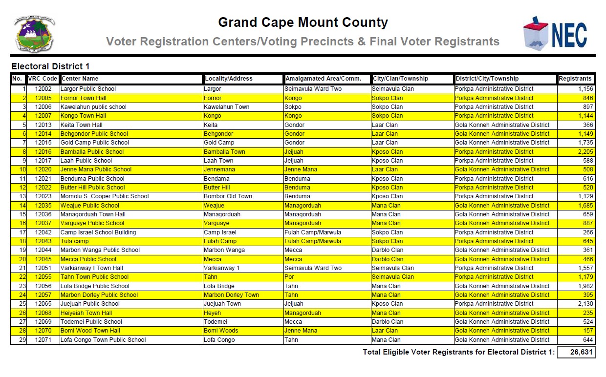 Grand Cape Mount Electoral District 1 has a registered voter population of 26,631 made up of 15,601 males and 11,030 females as of July 2023.