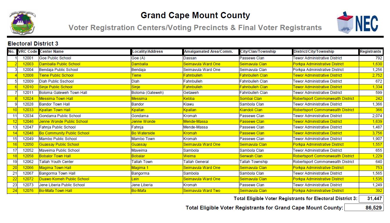 Grand Cape Mount Electoral District 3 has a registered voter population of 31,447 made up of 15,800 males and 15,647 females as of July 2023.