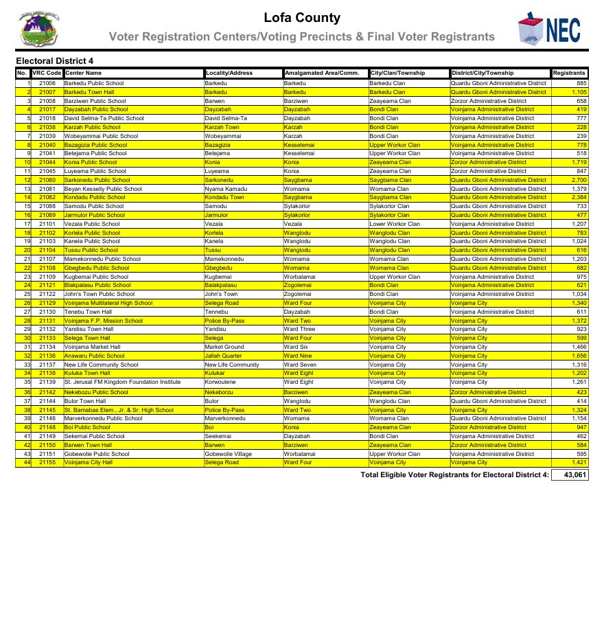 Lofa Electoral District 4 has a registered voter population of 43,061 made up of 20,579 males and 22,482 females as of July 2023.