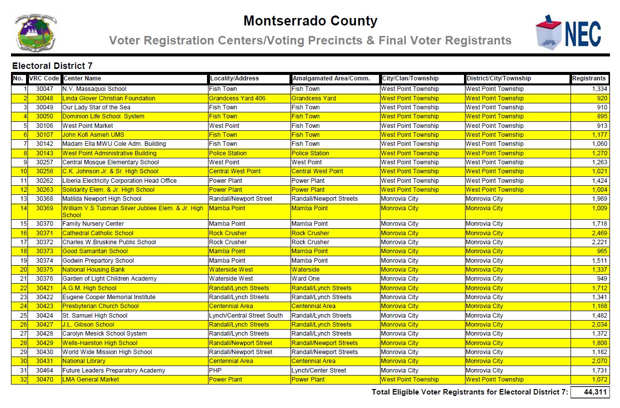 With 32 centers, the electoral district consists of all the following: all the communities in Ward One and Ward Two city wards in Monrovia City; and all the communities in West Point Township.
