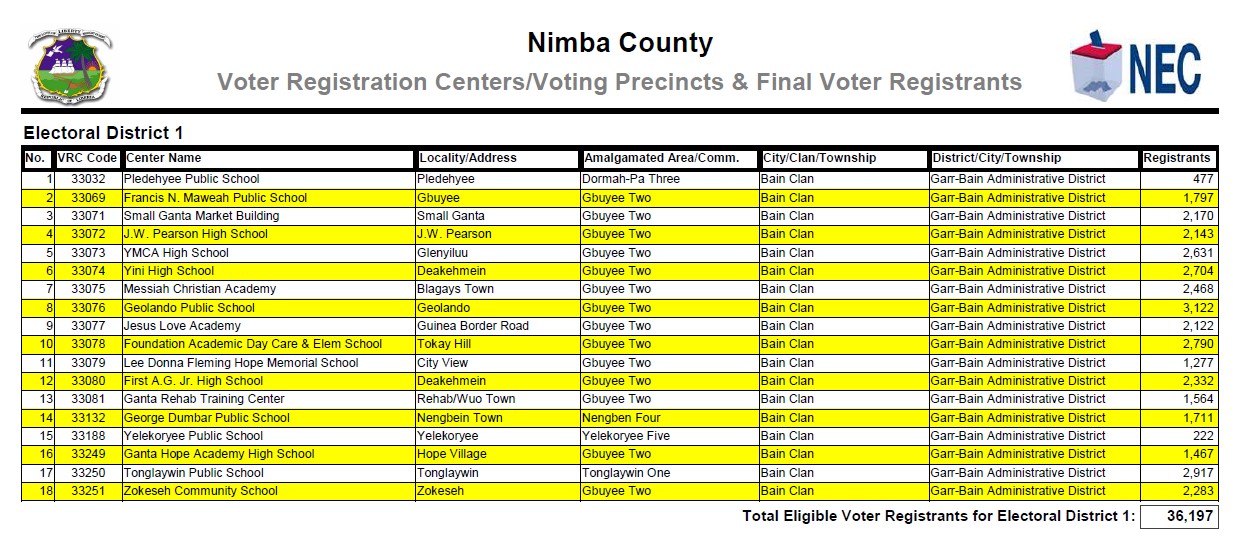 Nimba  Electoral District 1 has a registered voter population of 36,197  made up of   16,960 males and   19,237 females as of July 2023.