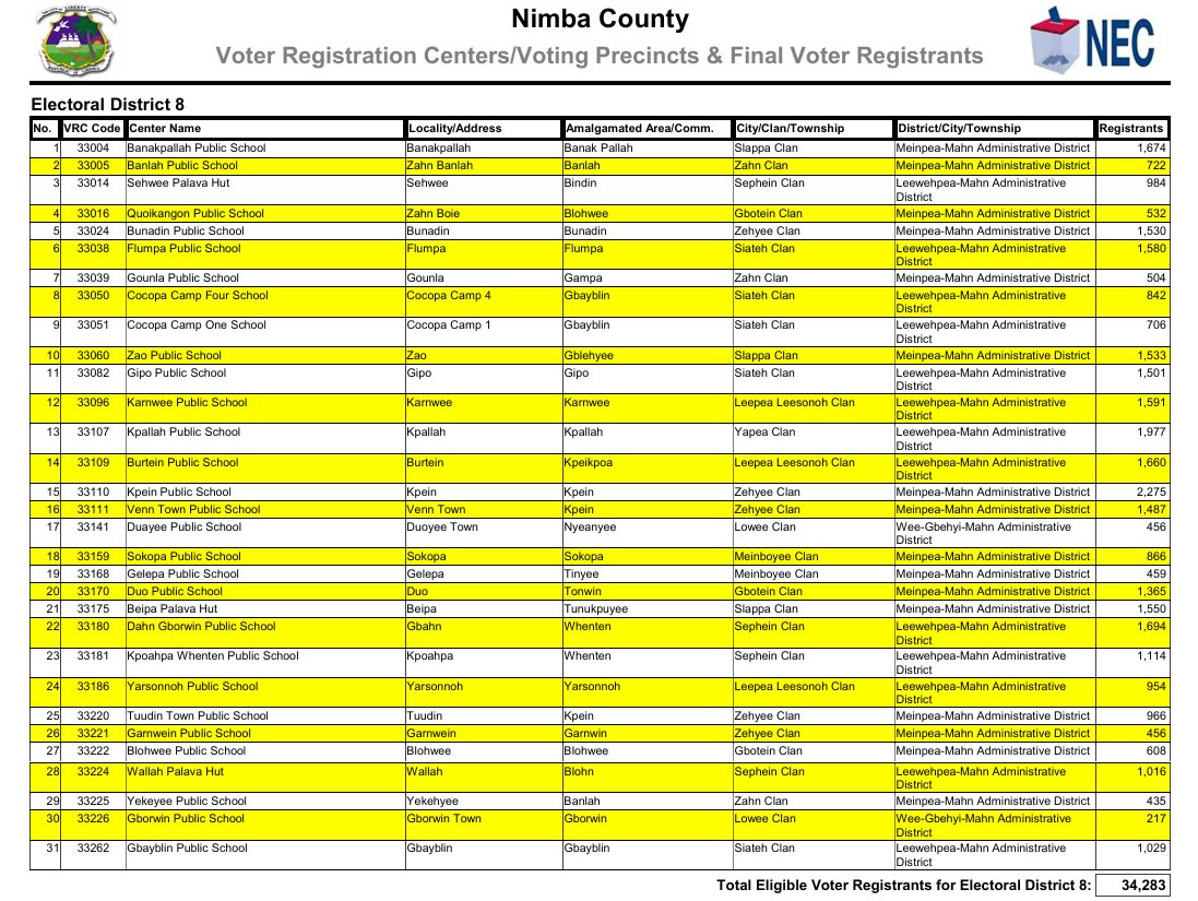 Nimba Electoral District 8 has a registered voter population of 34,283 made up of 16,931 males and 17,352 females as of July 2023.